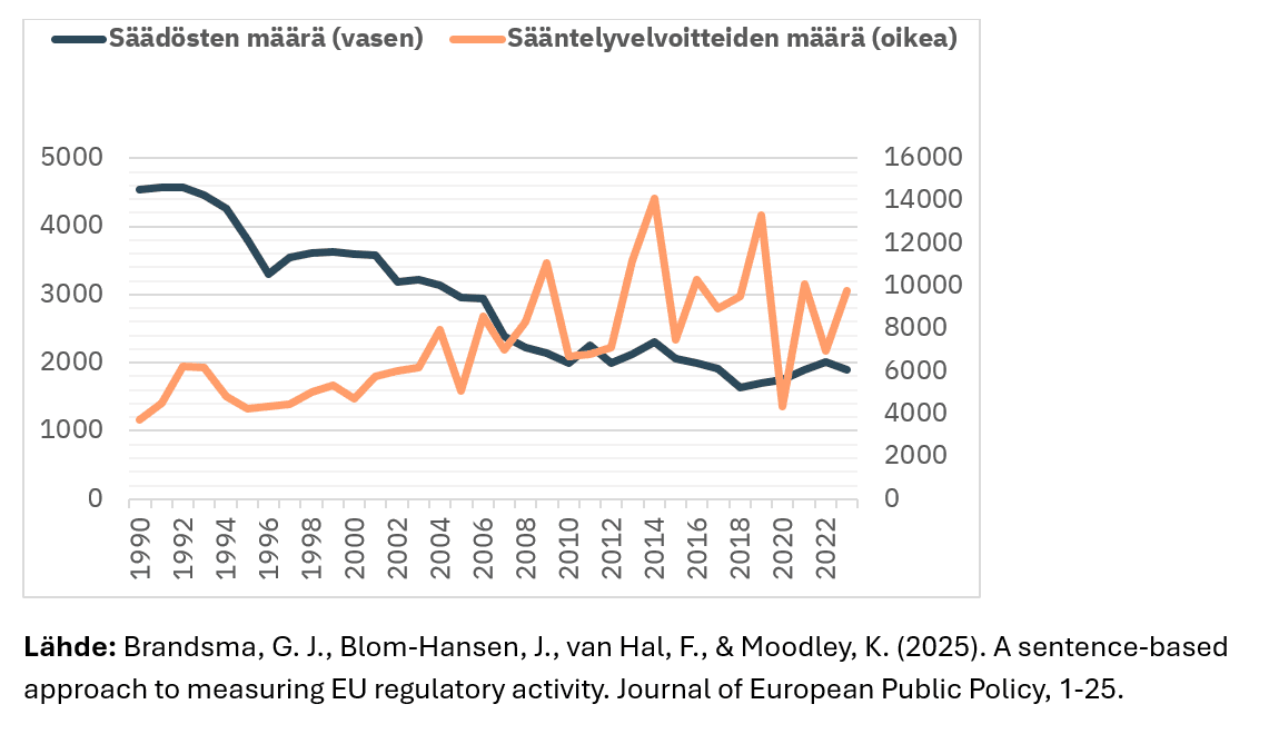 EU:n säädösten (asetukset, direktiivit ja päätökset) määrä on pitkällä aikavälillä laskenut, mutta yrityksille kohdistuvat velvoitteet ovat samaan aikaan kasvaneet. EU:n pitkäaikainen ”better regulation” -politiikka näkyy sääntelyprosessien kehittämisessä, kuten vaikutusarvioinneissa, yksinkertaistamisohjelma REFITissä ja ”one in, one out” -periaatteessa, mutta se ei ole johtanut sääntelyn tosiasialliseen vähenemiseen.
