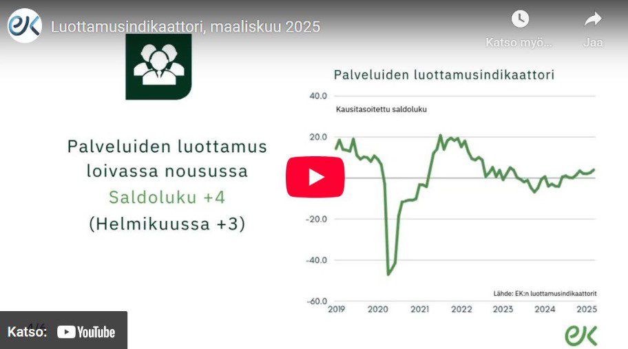 ”EK:n toukokuun suhdannetiedustelun perusteella suomalaisyritysten tilanne on kokonaisuutena vähitellen kohentunut alkuvuoden aikana. Erityisesti teollisuudessa on kuitenkin viime kuukausina näkynyt ulkoisen toimintaympäristön ja kauppapolitiikan epävarmuus. Suomalaisyritysten arviot ovat myös EU-keskiarvoa heikommat vähittäiskauppaa lukuun ottamatta”, Urrila jatkaa.