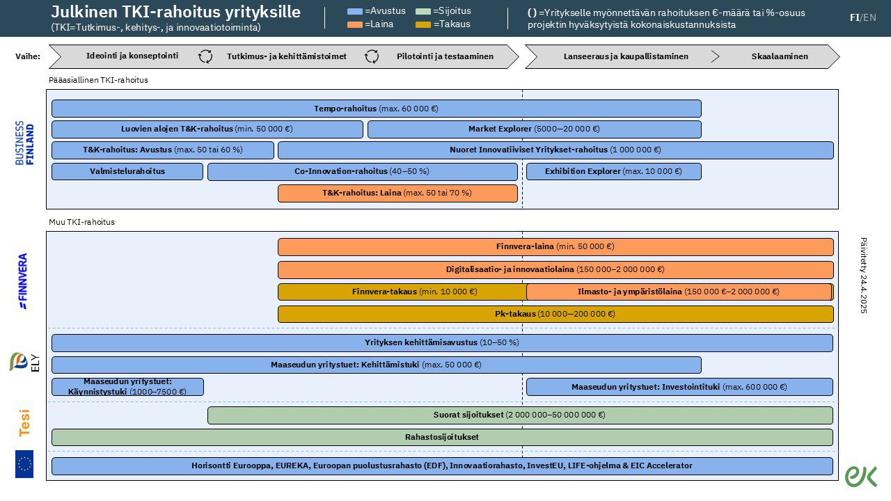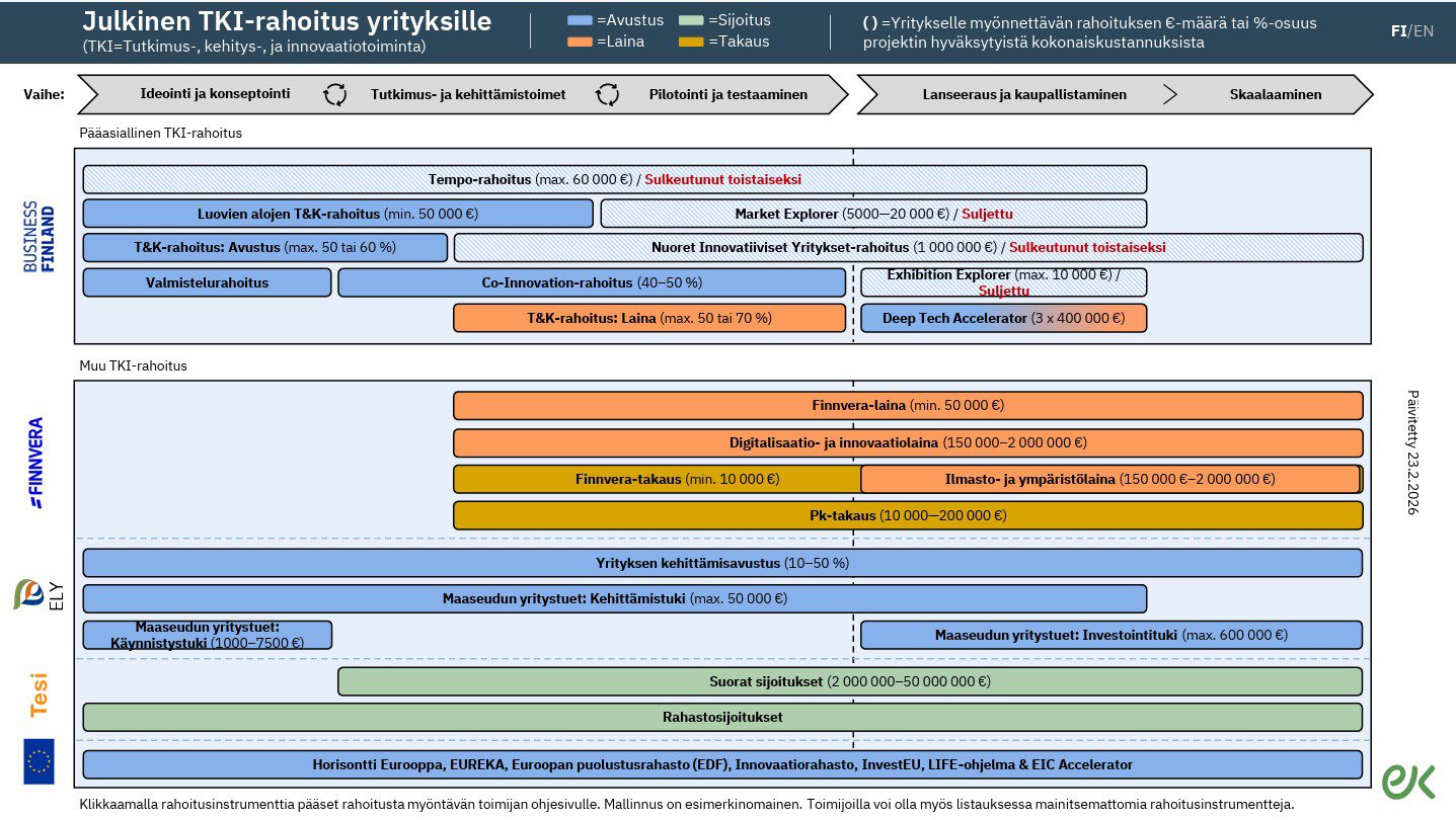 Yritysten tutkimus-, kehitys-, ja innovaatiotoimintaa (TKI) tukevalla julkisella rahoituksella on keskeinen rooli erityisesti pk-sektorin uudistumisen ja kasvun vauhdittamisessa. Silloin kun uuden liiketoiminnan kehittäminen on vielä riskialtista, yksityinen rahoitus ei useinkaan ole vielä yritysten ulottuvilla. Julkisen rahoituksen osalta on erityisen tärkeä varmistaa, että tutkimus- ja kehitystoiminnan (T&K) tuloksena syntyneitä innovaatioita saadaan myös kaupallistettua. EK:n yrityksille suunnattu uusi rahoituskartta kokoaa julkisen TKI-rahoituksen muodot yhteen kuvaan.