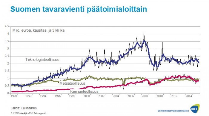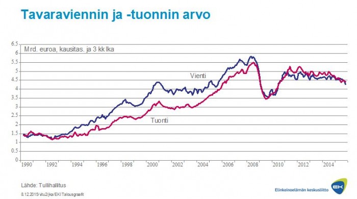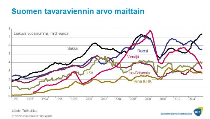 Elpyvien maiden voimistuva kysyntä erottuu maittaisessa tarkastelussa, joten kasvuennusteet eivät sinänsä ole epärealistisia. Vienti Saksaan ja Yhdysvaltoihin on lisääntynyt muita paremmin ja vienti Ruotsiinkin vähitellen elpyy. Kysynnän heikkous muissa päävientimaissa ja erityisesti Venäjällä on kuitenkin pitänyt mollivirettä yllä.