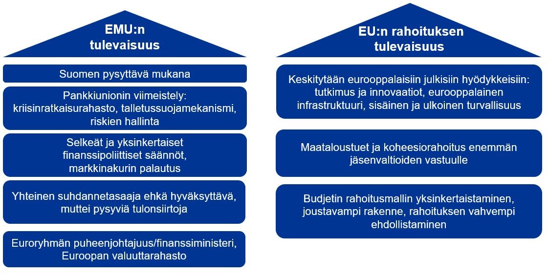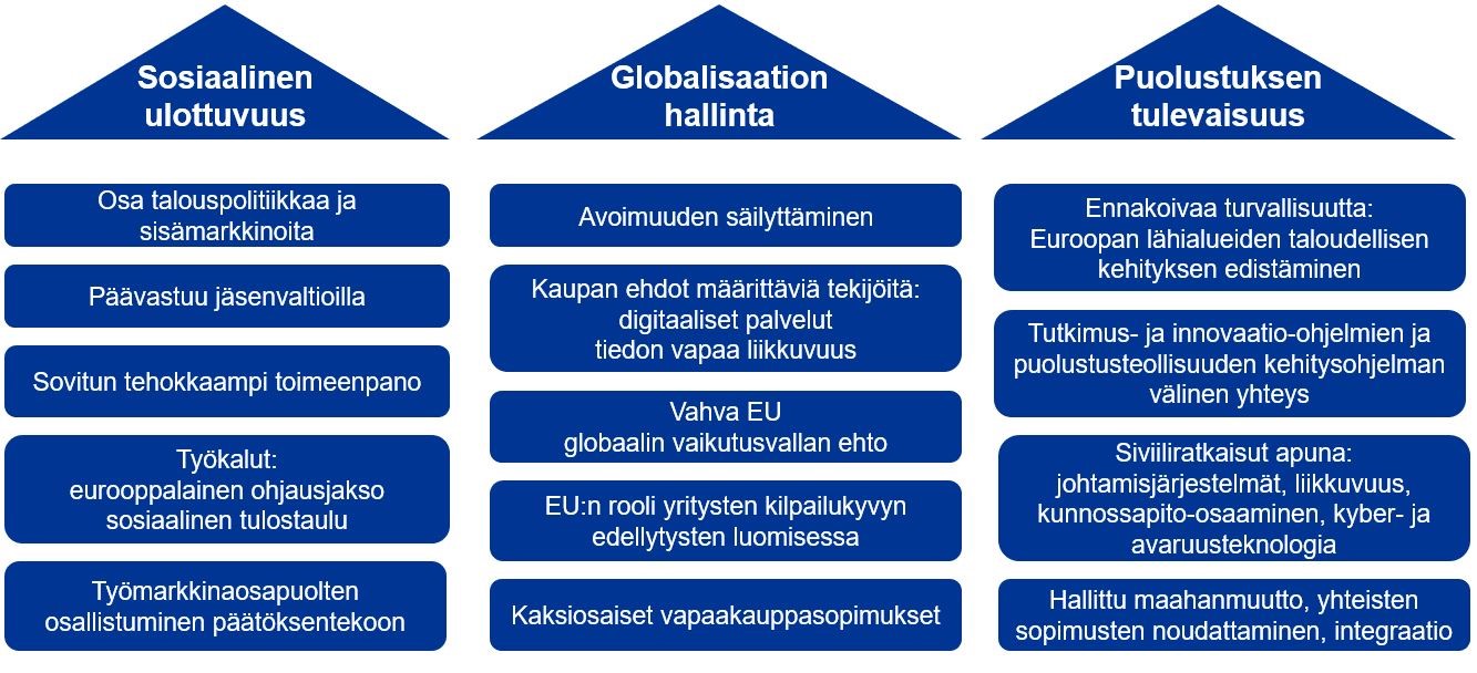 Raportissa nostettujen aiheiden lisäksi työ jatkuu aktiivisesti myös muiden Euroopalle tärkeiden aiheiden, kuten energian ja ilmaston, kiertotalouden ja digitaalisten sisämarkkinoiden parissa. Tätä työtä tarvitaan sen varmistamiseksi, että meillä eurooppalaisilla on tulevaisuudessa mahdollisimman paljon vapauksia ja vaihtoehtoja, joiden varaan hyvinvointi rakennetaan. Suomalainen hyvinvointi rakentuu eurooppalaisten sisämarkkinoiden, kansainvälisen yhteistyön ja kaupankäynnin varaan.