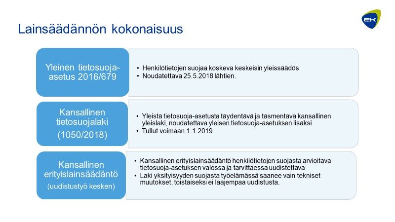 Uusi, EU-asetuksen myötä säädetty kansallinen tietosuojalaki tuli voimaan 1.1.2019. Asetuksen suoma liikkumavara kansallisille säädöksille on rajoitettu, joten EU-asetusta ja kansallista lakia on luettava ja sovellettava rinnakkain. EK:n laatimassa tietopaketissa kuvataan tiiviisti asetuksen yritysten kannalta keskeistä sisältöä. Tietopakettia päivitetään, kun tietosuoja-asetuksesta muodostuu soveltamiskäytäntöä.