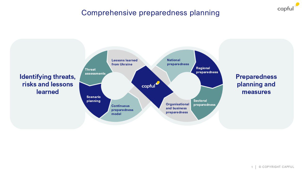 Capful is Finland’s leading consultancy specialising in strategic foresight and scenario-based strategy work. Founded in 1999 in Helsinki, we bring over 25 years of experience helping organisations understand how their operating environment may change — and prepare accordingly. Since 2012, we have built a continuously growing portfolio of preparedness and security-related foresight projects for Finnish government agencies and critical infrastructure sectors, including classified work at the highest levels of national preparedness.